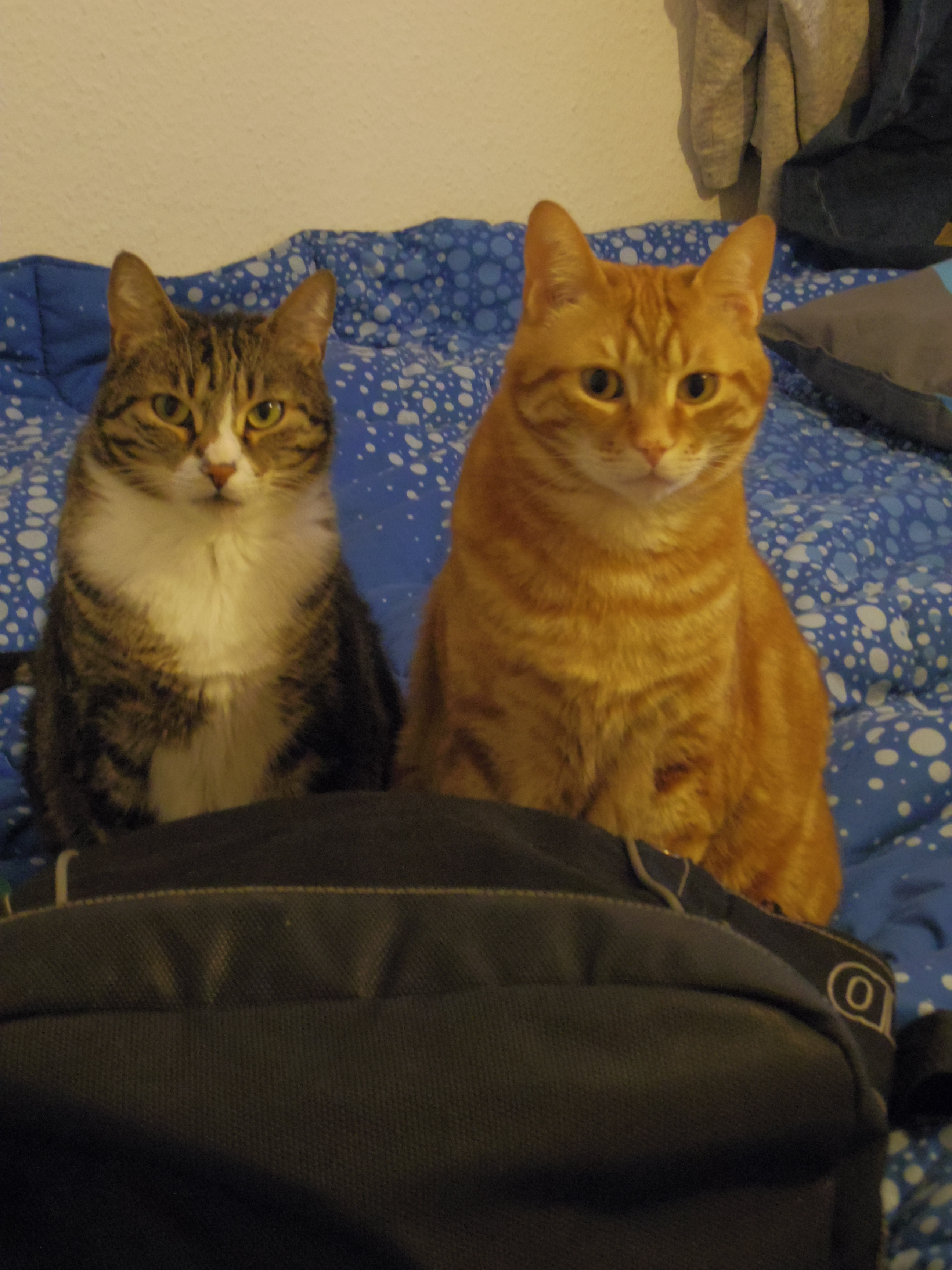 Siamo gemelli, un maschio rosso e una femmina grigia… la mamma e il papà umani ci lasciano sempre qualcosa sul letto per riposare… e poi ogni tanto accendono una macchina fotgrafica e ci fanno uno scatto… avranno migliaia di foto di noi due, ma continuano a scattare… ma siamo così belli???
